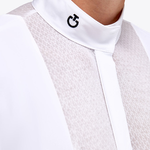 This competition t-shirt is made of jersey fabric and features a semi-sheer lace panel on the back and front that outlines the silhouette.