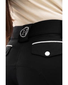 Two false back pockets with flaps and rhinestone piping on the back of the trousers