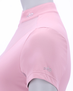 The transparent mesh insert on the front and under the arm provides enhanced ventilation and breathability. A concealed zipper at the front adds a sleek touch, while the stand-up collar is decorated with a stylish rhinestone motif.