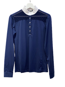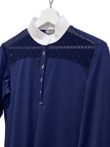 In the upper part, the T-shirt has delicate mesh inserts decorated with Swarovski crystals