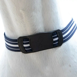 It has white and blue rubber and leather straps with adjustments on both sides.