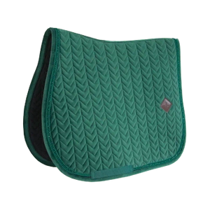 The outside of the saddle pad is made from Kentucky famous and soft velvet fabric in fishbone quilting. The piping is finished off with chic pearls. The lining of the saddle pad is a cotton and polyester mix which easily absorbs sweat and is very breathable.