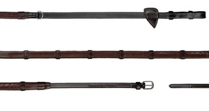 Gumowe wodze z 7 skórzanymi stoperami z ozdobnymi szwami i pojedynczym pierścieniem D przymocowanym na początku wodzy do użytku w połączeniu z wytokiem.