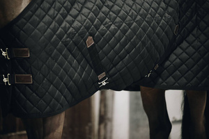 Tkanina zewnętrzna z poliestru 600D jest bardzo odporna na rozdarcia, kwadratowe pikowanie. Derka ta nie zawiera żadnego wypełnienia, jednak sztuczne futro królika tworzy maleńkie kieszenie powietrzne, które zatrzymują i utrzymują ciepło ciała konia. Sztuczne futro królika zapobiega również otarciom i nadaje koniowi błyszczącą sierść.