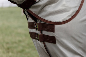 Derka Mesh Fly Rug Classic jest wykonana ze strukturalnej tkaniny siatkowej, która utrzymuje większość much i owadów z dala od konia. Siateczka jest niezwykle lekka, a jednocześnie oddychająca, dzięki czemu doskonale sprawdzi się na padoku podczas cieplejszych dni. W obszarze klatki piersiowej materiał od wewnątrz jest płaski. Jest miękki w dotyku, co zapobiega otarciom i sprawia, że żadne włosy nie przyklejają się do derki.