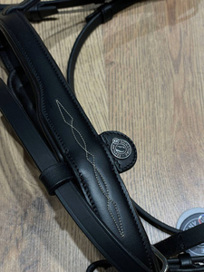 Fantazyjnie przeszycia, lekko podwyższone, podszyte nachrapnik i naczółek