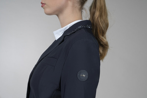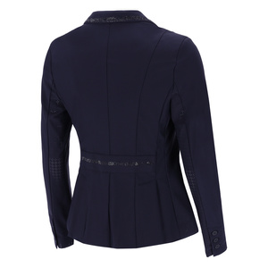 Ten stylowy, funkcjonalny frak konkursowy ma kieszenie z lamówką z klapkami i zdobieniami z kryształków, które dodają odrobinę blasku.