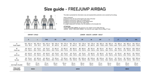 Rozmiary dziecięce S i L są odpowiednie dla dzieci o wadze co najmniej 25 kg i wzroście co najmniej 130 cm. Poduszka powietrzna FREEJUMP AIRBAG jest przeznaczona dla osób o wzroście co najmniej 145 cm i wadze co najmniej 35 kg, począwszy od rozmiaru XXS.