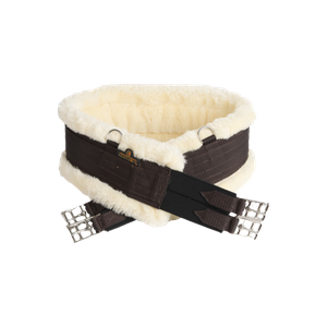 Popręg z owczej skóry ma gumki na obu końcach, aby wyrównać nacisk, a także trzy pierścienie D, aby móc dopiąć pomoce jeździeckie.