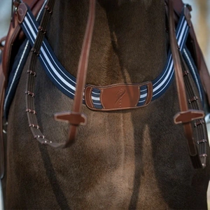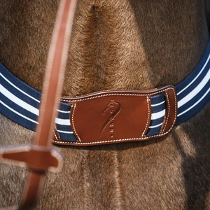 Posiada biało niebieską gumę oraz skórzane paski z regulacją po obu stronach.